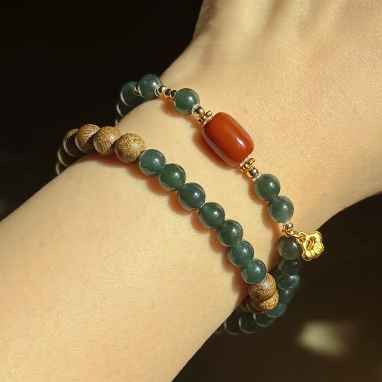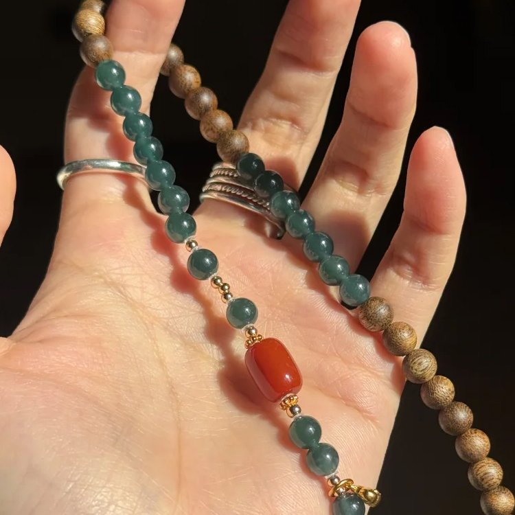 This 2-Layer Bracelet with Green Qi Nan Agarwood, Blue Water Jadeite and Southern Red Agate gathers the spiritual energy of heaven and earth. Agarwood purifies the mind, jadeite guards the original heart for clarity, red agate warms the heart to attract blessings, in line with Buddhist heart-cultivation. Worn to release elegant fragrance with body temperature, it brings peace, lasting good fortune and smoothness in all things.