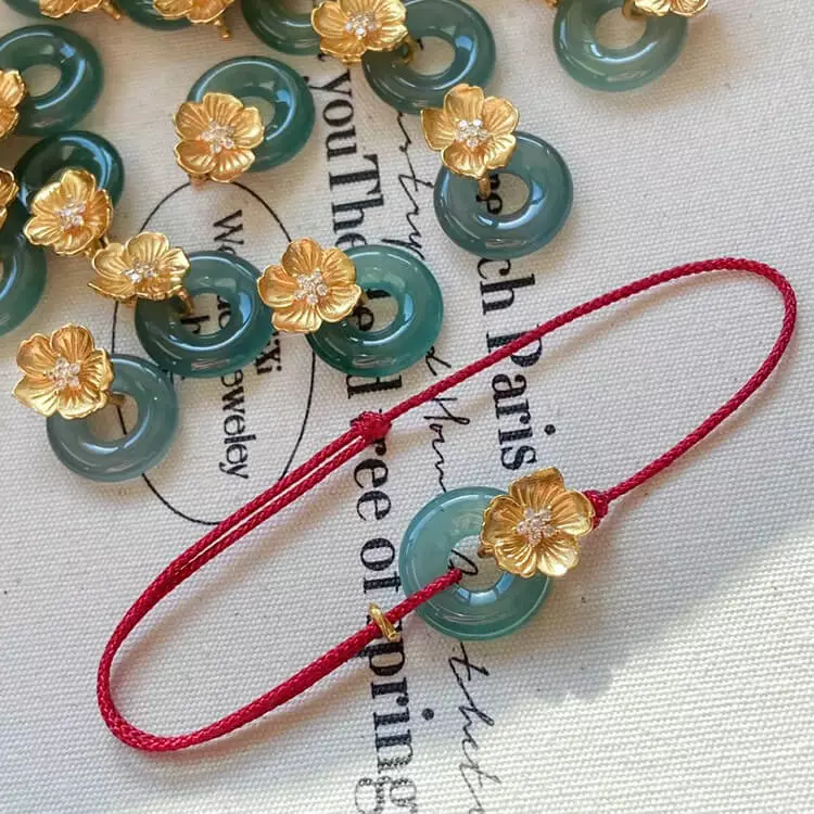 Red bracelet conveys affection, jade nourishes the heart. The safety coin protects, and the golden flower blooms with beauty, wishing you a life of happiness and well-being.