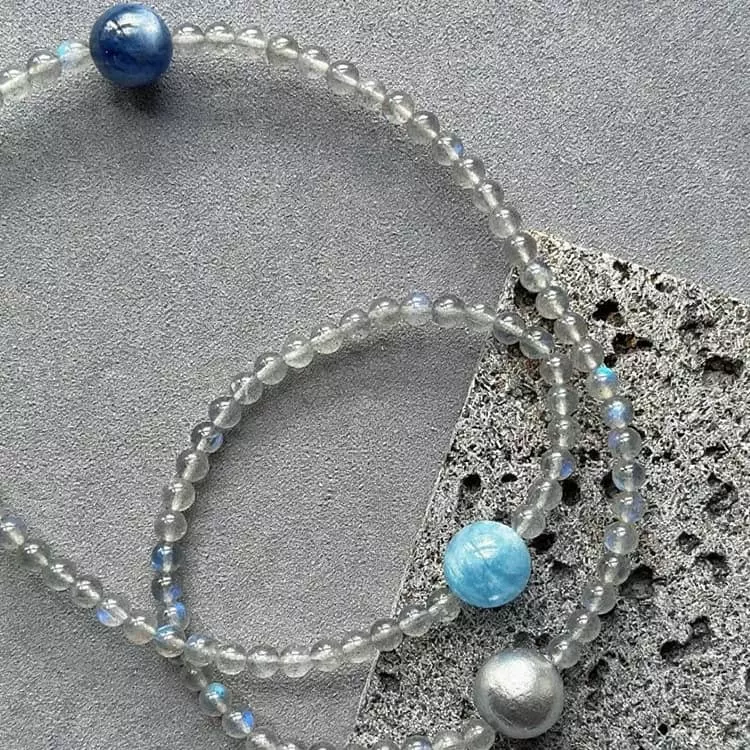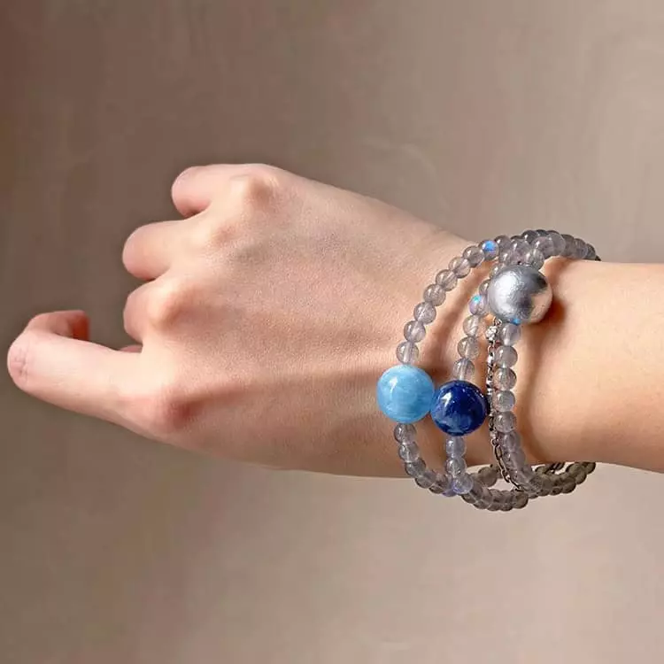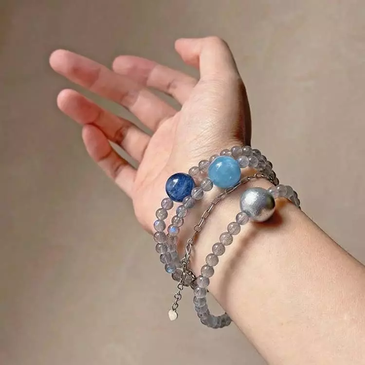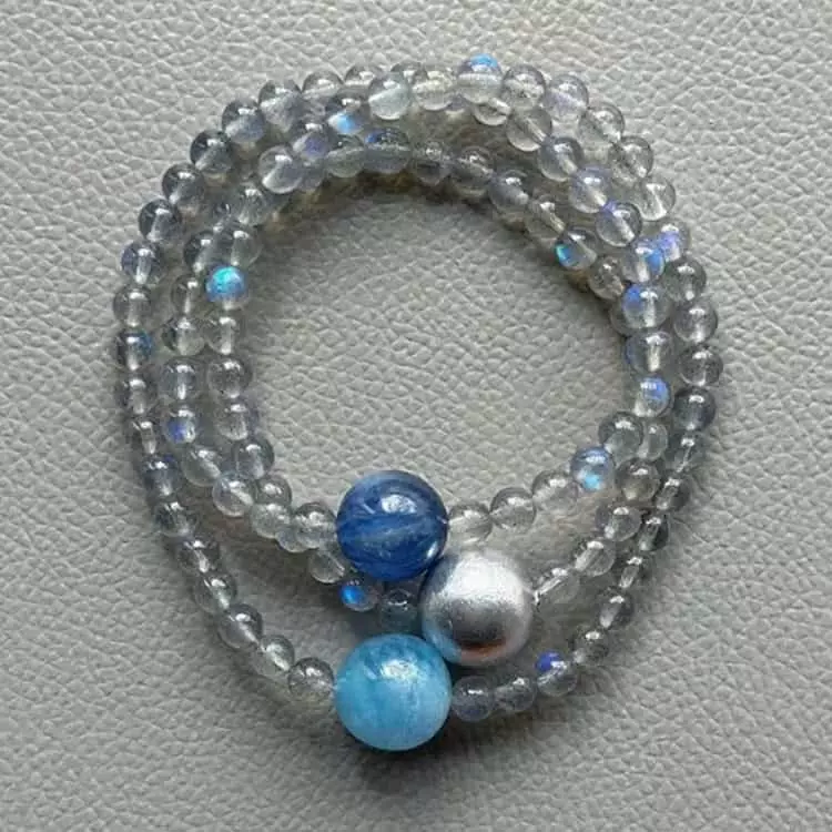 Crafted with natural Labradorite, Kyanite, and Aquamarine, this triple-strand bracelet blends serene blue and muted gray tones, resonating with the Feng Shui harmony of water and wood to attract flowing prosperity and clarity. Labradorite mirrors celestial protection, Aquamarine channels calming ocean energy, while Kyanite fosters mindful communication. The dynamic contrast of bead diameters amplifies modern elegance, and platinum or silver accents purify its aura, echoing Buddhism’s “Threefold Training” (ethics, meditation, wisdom) through wearable artistry.